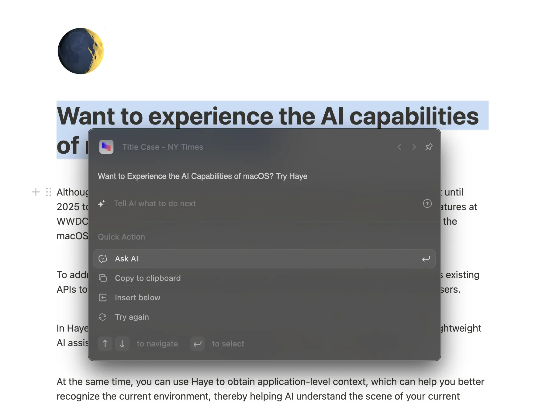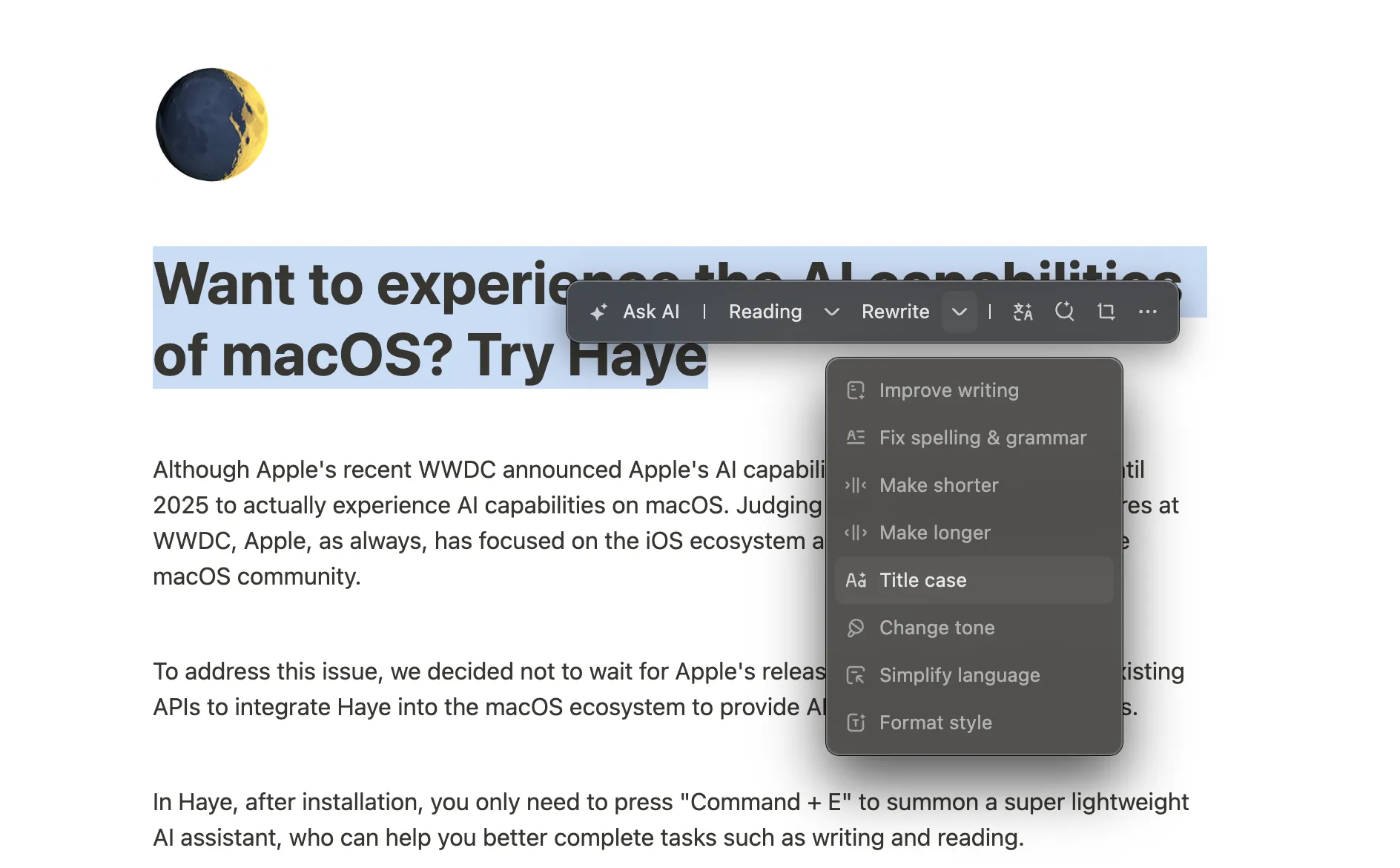 Haye simplifies applying title case by automatically formatting selected text according to the chosen style, saving you time and effort. Give Haye a try for easy and accurate title case formatting!